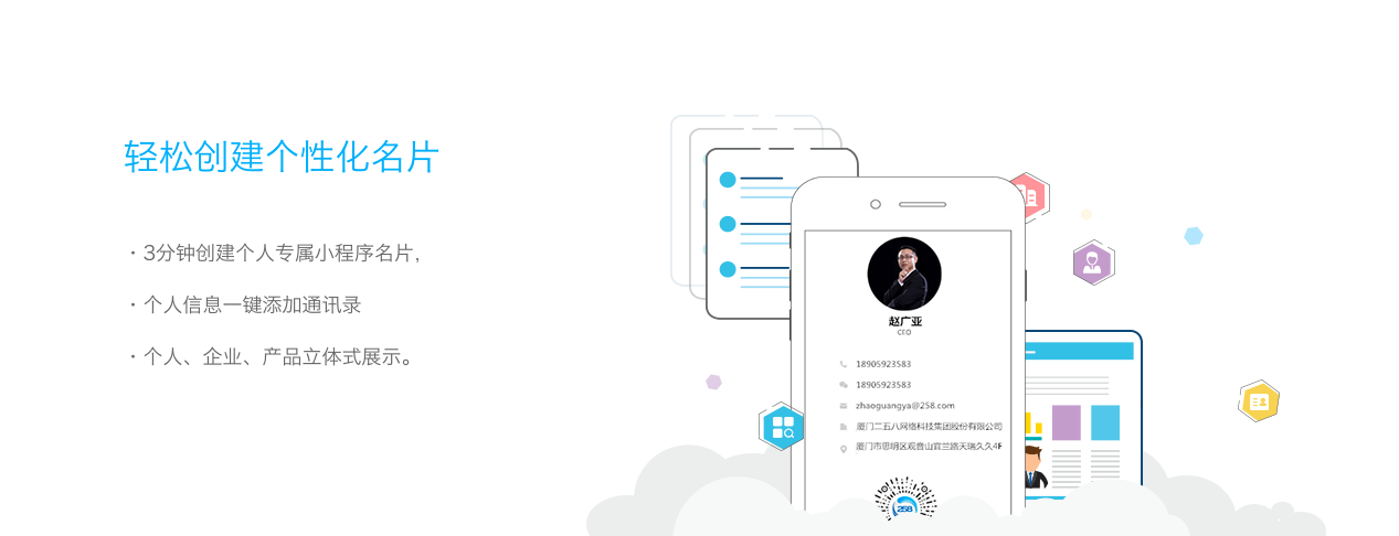 可以幫你實(shí)現(xiàn)3分鐘輕松創(chuàng)建專屬個(gè)性化小程序名片,個(gè)人信息一鍵添加通訊錄,個(gè)人、企業(yè)、產(chǎn)品全方位展示。AI智能【超級(jí)名片】讓你從此告別手機(jī)拍名片,陌拜、會(huì)議、展會(huì)等,打開二維碼即可瞬間將名片“遞”給上千人,展示企業(yè)實(shí)力,突出產(chǎn)品優(yōu)勢(shì),讓銷售更“靠譜”。同時(shí)利用社交小程序連接10億用戶,一鍵轉(zhuǎn)發(fā)至微信好友、微信群,線下物料印刷二維碼,實(shí)現(xiàn)O2O閉環(huán),客戶掃一掃信息即記錄在案,便捷連接。